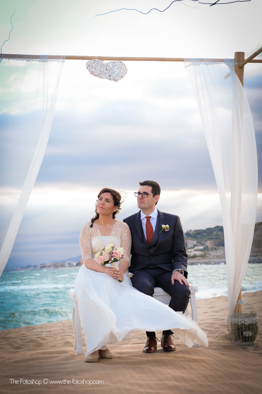 Y llegaba la novia, mientras se podía escuchar el sonido de las olas y el viento. El día estaba lleno de nubes, pero no pudo eclipsar a una radiante y bellísima novia, camino al altar, al encuentro de un elegante novio, Arnau. Ella llevaba un perfecto look, acorde al lugar de celebración. Un precioso vestido con corte palabra de honor, vaporoso y con pliegues más chaquetilla ligera de encaje en color crema. Completaba su estilismo un fajín de raso en tonos beiges con brillantes, que aportaba justo ese toque sofisticado, perfecto para una boda frente al mar. Y qué decir del ramo, de rosas naturales. ¡No podía ser más bonito y acertado!.