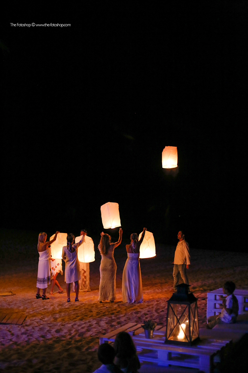 La ceremonia playera dio paso al cocktail, al que no le faltó detalle y en el que lo que más destacó fue, sin duda, la complicidad entre los asistentes y los novios. Pura diversión, expontaneidad y buen rollo fueron la tónica de una tarde noche que culminaba con la suelta de farolillos de luz sobre la perciosa bahía.